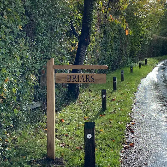 Our collection of solid oak personalised and bespoke wooden signage includes everything from wall-mounted plaques to milestone posts, crafted to add timeless elegance and functionality to any space.