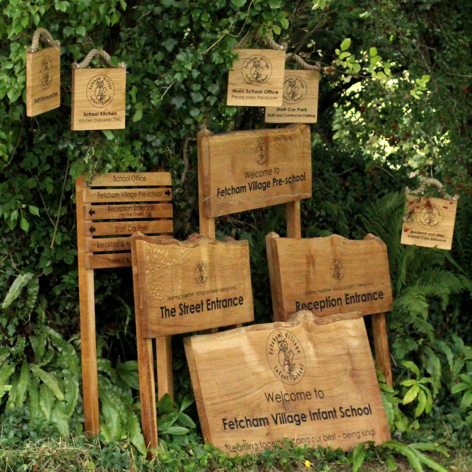 A collection of large and small live-edge oak signs featuring the school’s logo, complemented by rope-hanging pieces. Together they create a strong, cohesive brand identity and a warm, natural aesthetic throughout the school.