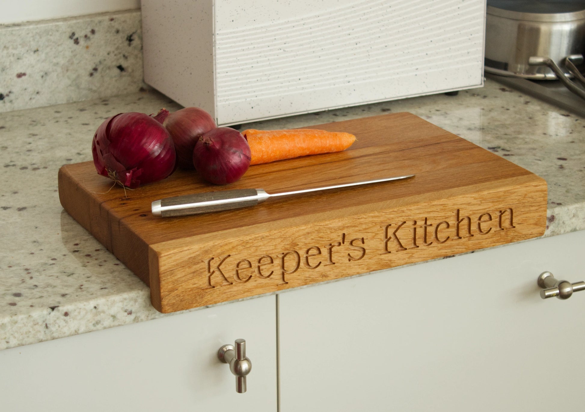Our handmade oak chopping boards are engraved on the front lip that hangs over your countertop, keeping the board firmly in place while adding a beautiful personalised touch.